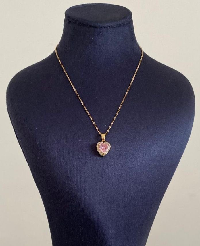 Çelik Kalp Pembe Taşlı Kolye